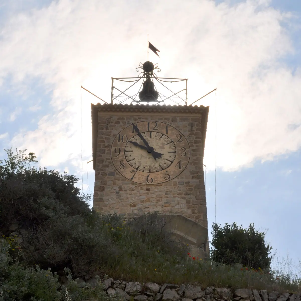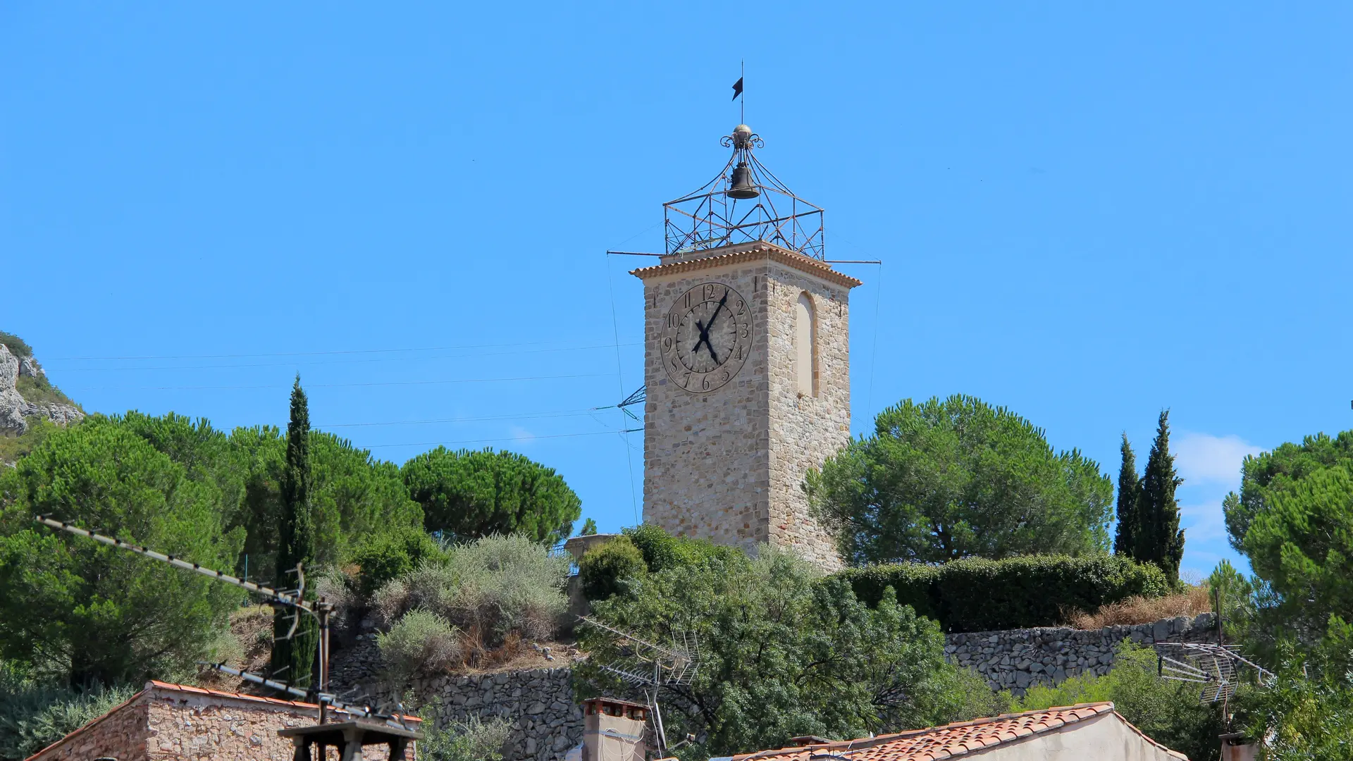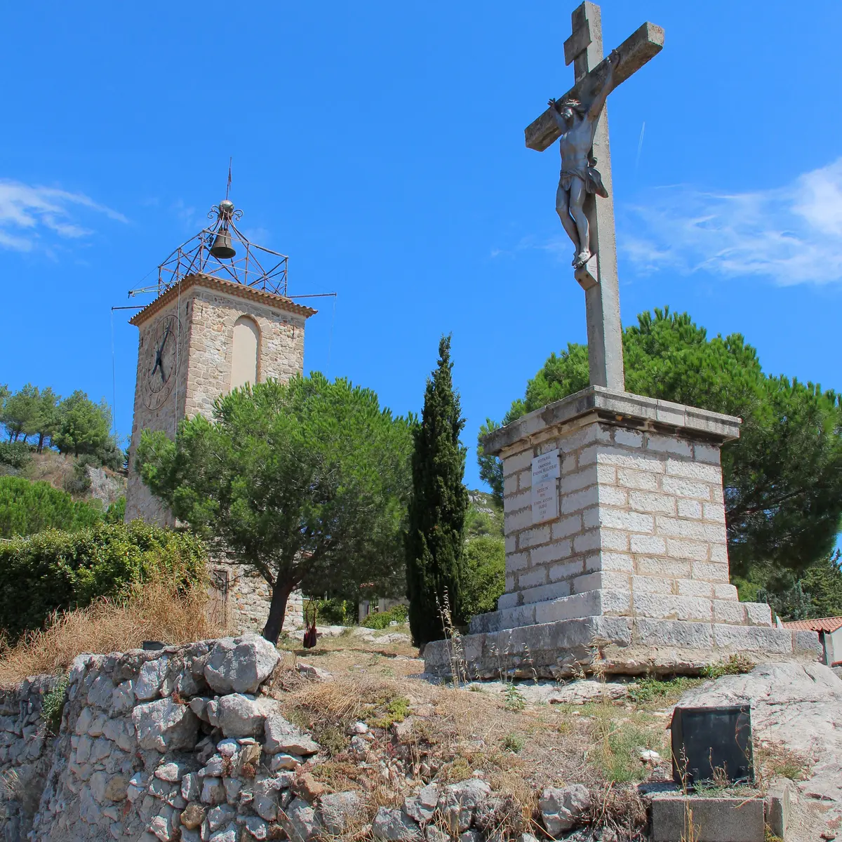 The medieval church was built between 1150 and 1250, at the same time as the castle and the medieval village. Only its bell tower remains, known as the "Tour de l'horloge", overlooking the village.