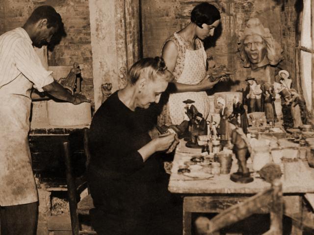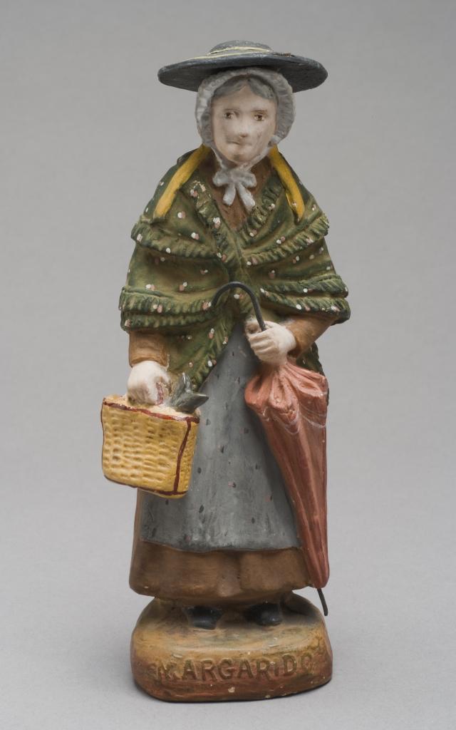 At the end of the 19th century, Thérèse Neveu (1866-1946), known as la Dame de Clastre (Lady of Clastre), lived right here, next to the presbytery, in a house that was also her workshop. She developed a traditional family activity for which Aubagne is still famous nowadays: little clay figurines called “santons”. Thérèse started a renewal of this centenarian art by making santons out of the typical figures she was surrounded by daily. That’s how Margarido, the vicar’s cousin noticeable by her red umbrella, was born in 1890. Many other figures would follow, mainly coming from Maurel’s pastoral.