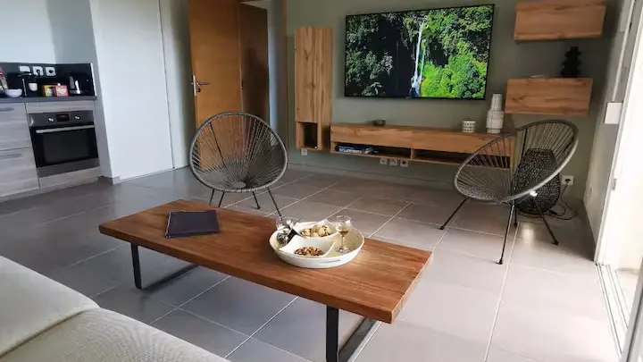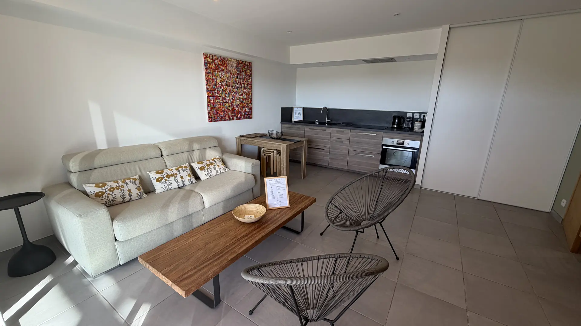 The kitchen opens onto the living room and is fully equipped with oven, fridge, microwave, dishwasher, coffee machine, utensils and washing machine.
